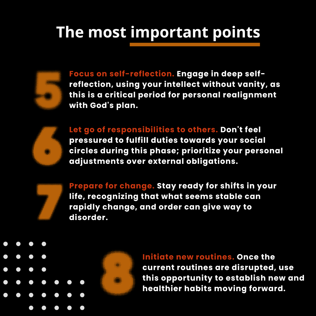 This is a time of self-reflection and of using your intelligent mind without vanity. Don't focus on your duty towards your network or the people you feel responsible for during this time. You are currently closing a grand cycle within God's plan for your life. This is all about where you went wrong personally, so you can readjust this. This is a great time to start new routines after your current routine has been broken up by the divine whirlwind going through your life.