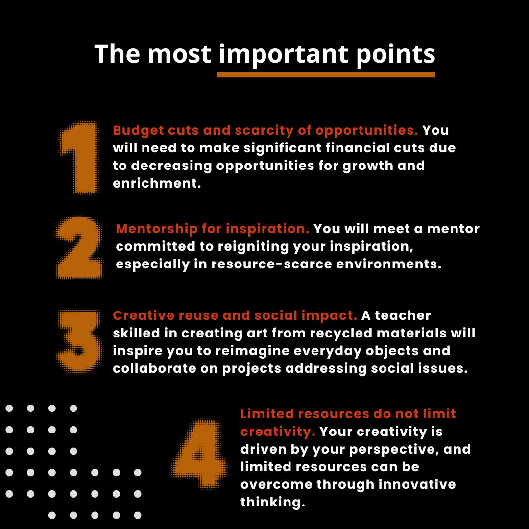 You might be scared that you will be losing your creative outlet, but luckily there is a teacher who is known for creating masterpieces out of recycled items that will be advising you. Through visionary leadership, you will be inspired by this person to reimagine everyday materials and collaborate with others on impactful projects highlighting social issues. Despite only having very limited resources, you are being reminded that your creativity is entirely based on the way you see things.