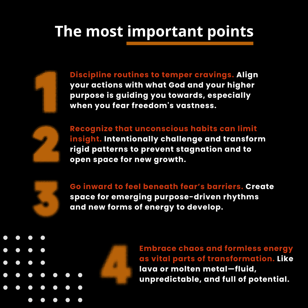 In the gap that will be left in your life because you have consciously renounced any kind of rigidity, temptation will arise, a chaos that will cry out for renewed certainty. The void that is left will be very active, which will cause both hope and horror within you as you stand face-to-face with the responsibility that comes with the freedom to craft self by conscious choice. A self that is not created by compulsion which is caused from avoiding your own inner demons.