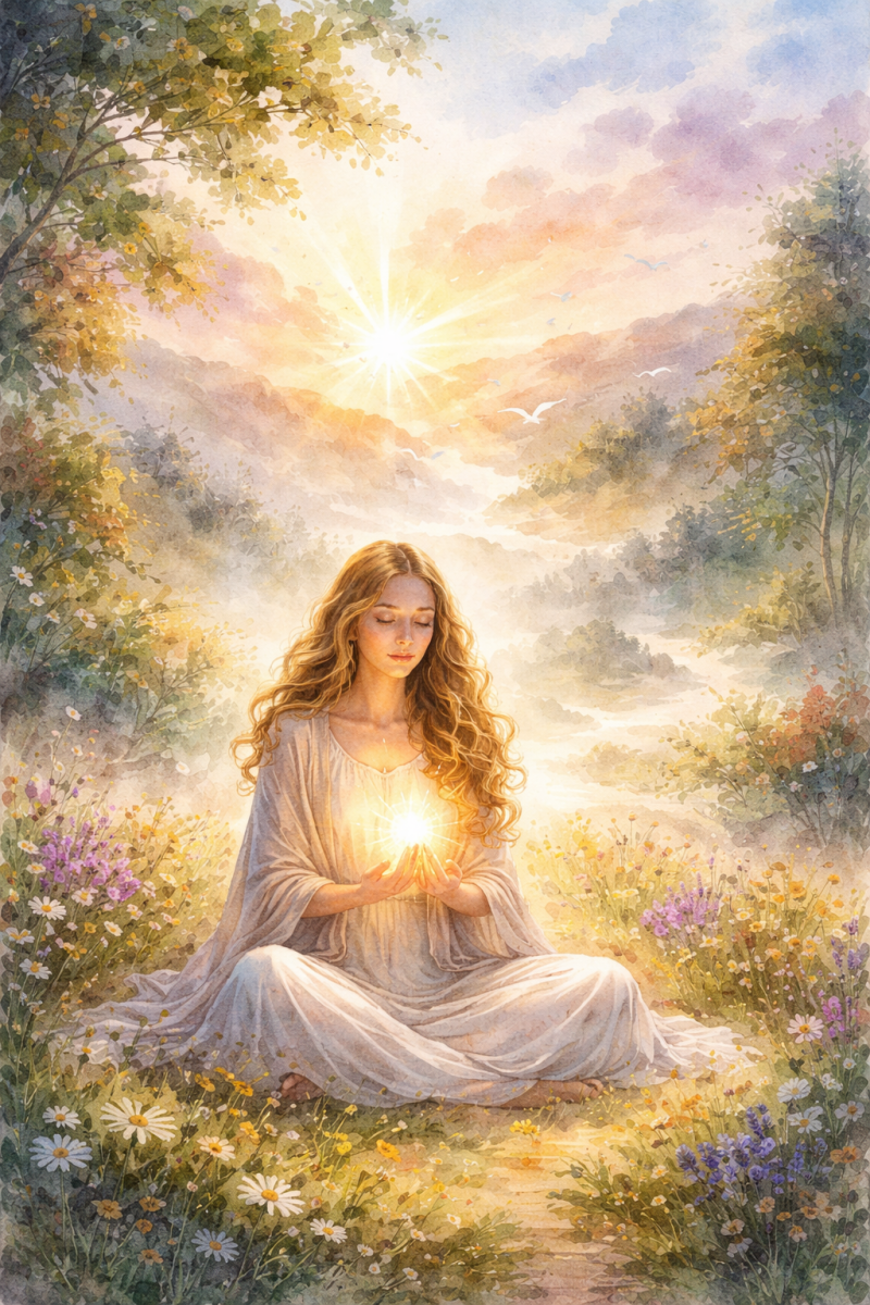 The image shows the transition from peaceful grounding to divine momentum. The figure is shown in a seated, meditative posture amidst a serene meadow, embodying a sense of stillness and peace. She holds a glowing light at her center, which represents what wishes to rise within her and the big idea that is currenlty being grounded into her internal foundation.