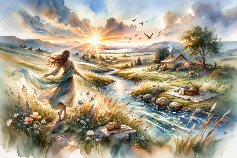 Following the gentle guidance of her ancestors, a woman finds herself standing amidst a sun-drenched valley where her past efforts finally begin to bloom. She feels as light as a breeze flowing over the open fields, realizing that her humble spirit has allowed her to find a solid place in the world. Beside her, a winding river reflects the persistent movement of life, symbolizing the ripples of impact she is now making. Though her surroundings move at a fast pace, she remains incredibly stable at her core, a receptive vessel for the new experiences flowing toward her. Nearby, a cozy cottage and a prepared picnic signify the beauty of a simple, domestic life and the kindness found in human connection. Embracing this moment of transition, she prepares to flow with the flexible growth that her steady progress has earned.